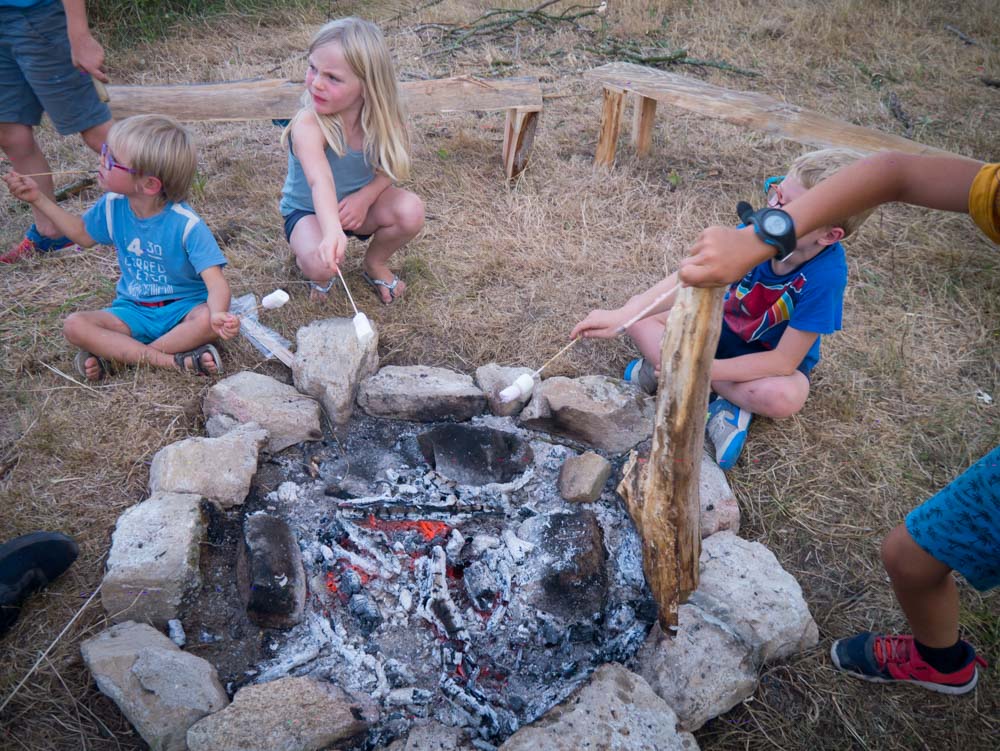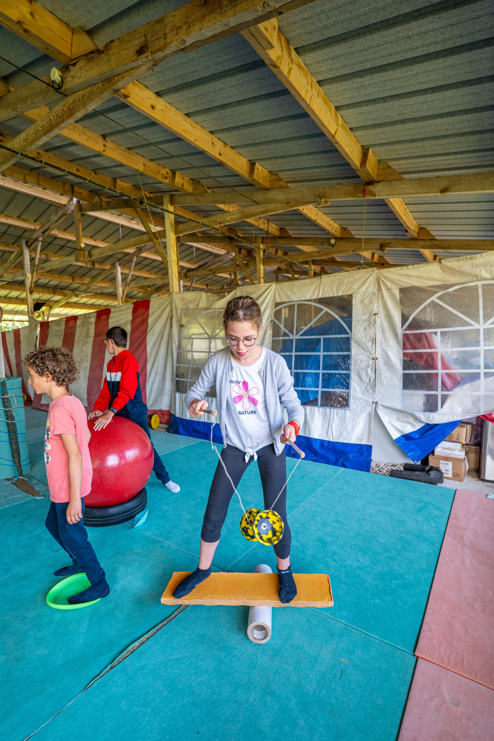 Barnums repas et d’activités (atelier bois et cirque), bloc sanitaire avec douches et toilettes, toilettes sèches et composteur, sous-bois pour cabanes, hangar de repli en cas de tempête.